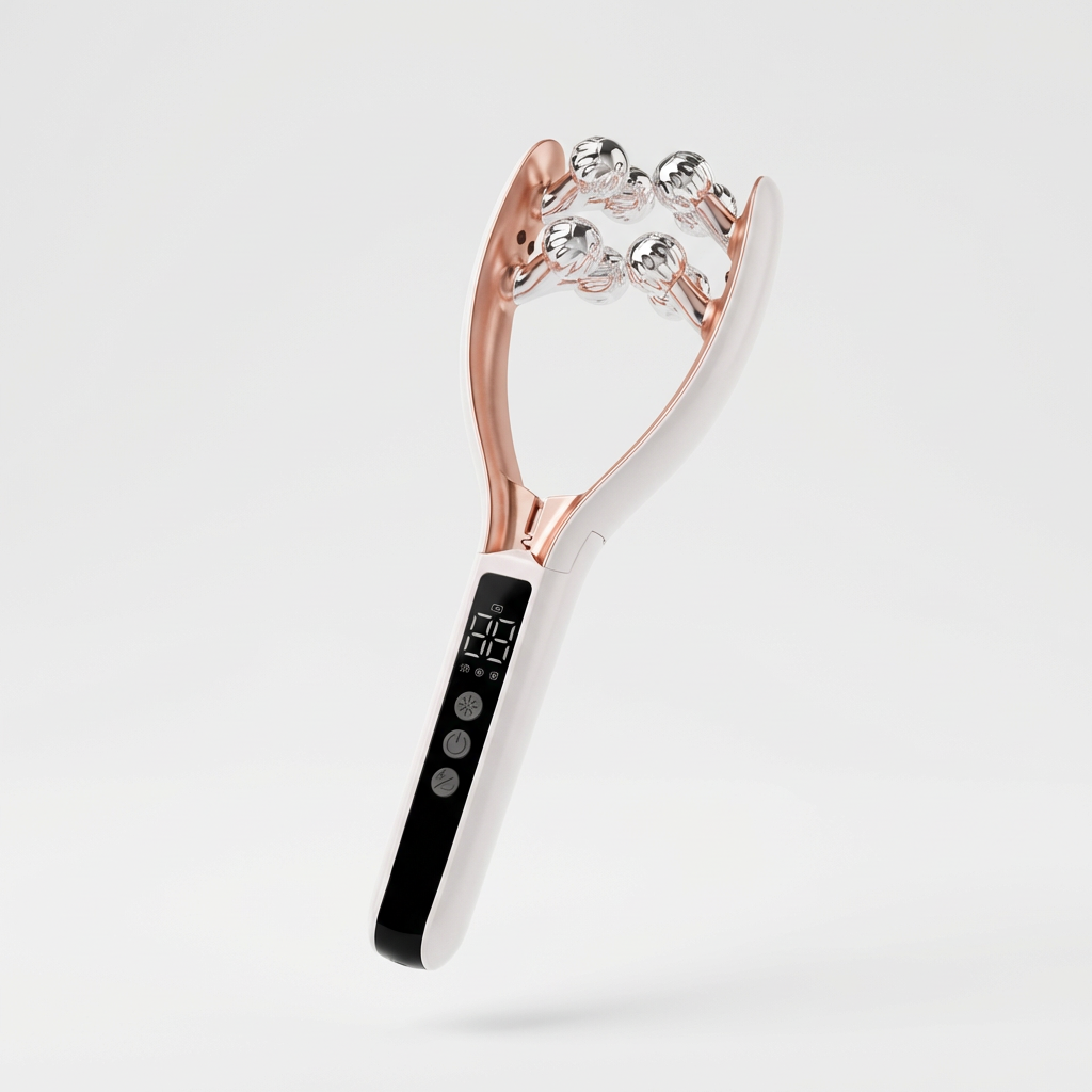 Gently glide the dual rollers upward along the jawline, cheeks, neck, and under-eye area.